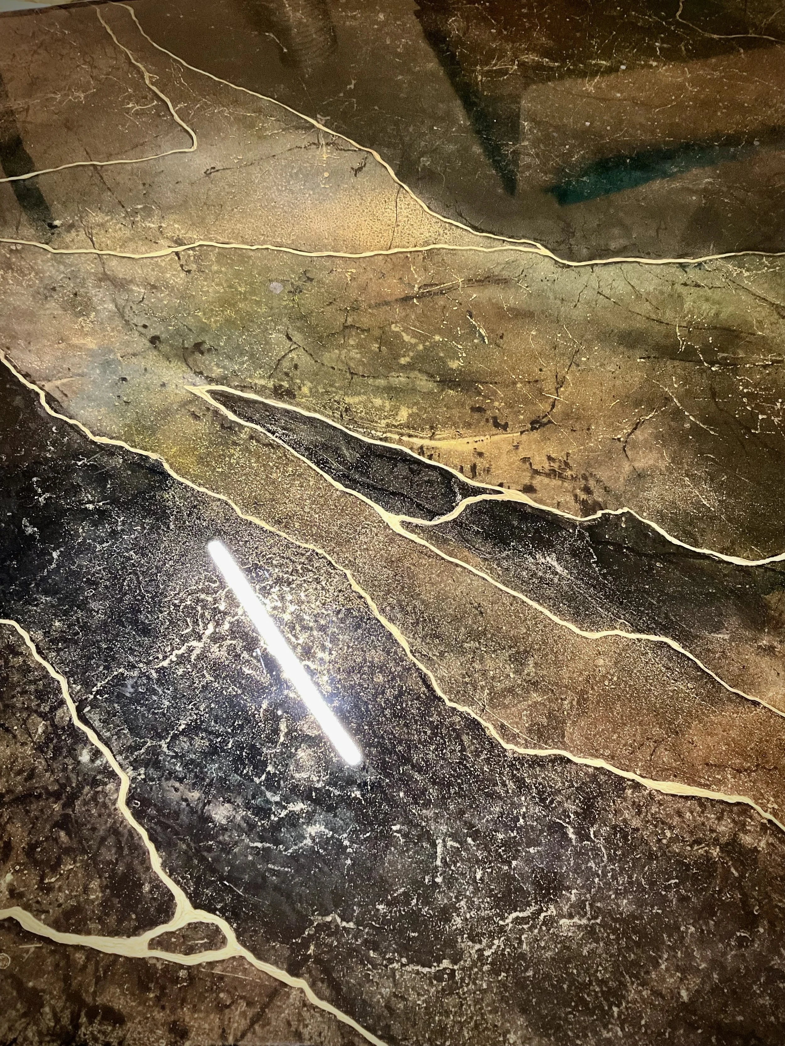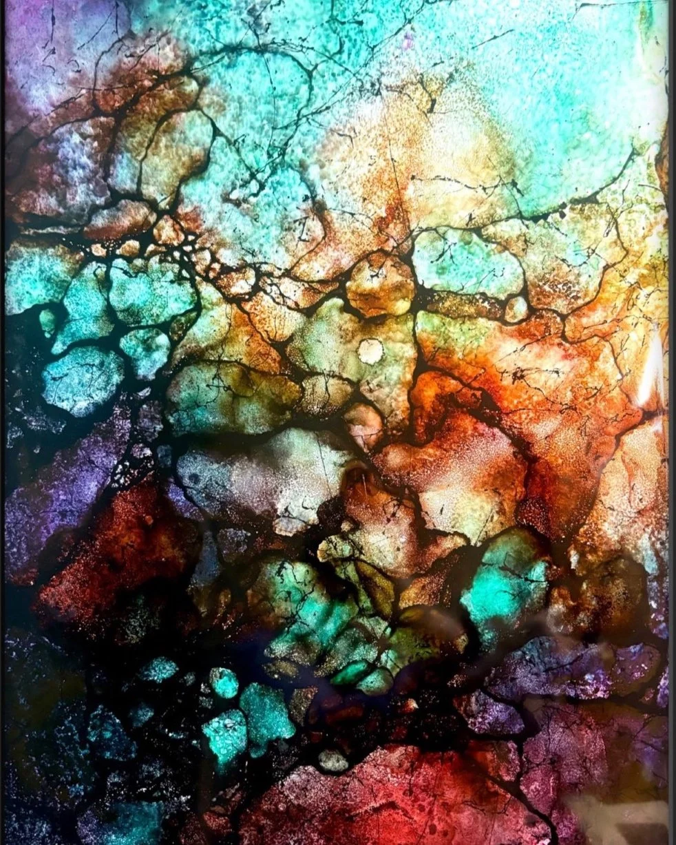 Alkoholtinten besitzen eine einzigartige Eigenschaft: Sie fließen mühelos auf glatten Oberflächen und lassen sich nur mit viel Geschick kontrollieren. Ihre Transparenz und Intensität erschaffen ein fast ätherisches Farbspiel, das ich durch einen Überzug aus klarem Resin veredle. Die Kombination aus fließender Leichtigkeit und glänzender Tiefe macht diese Werke besonders faszinierend.
