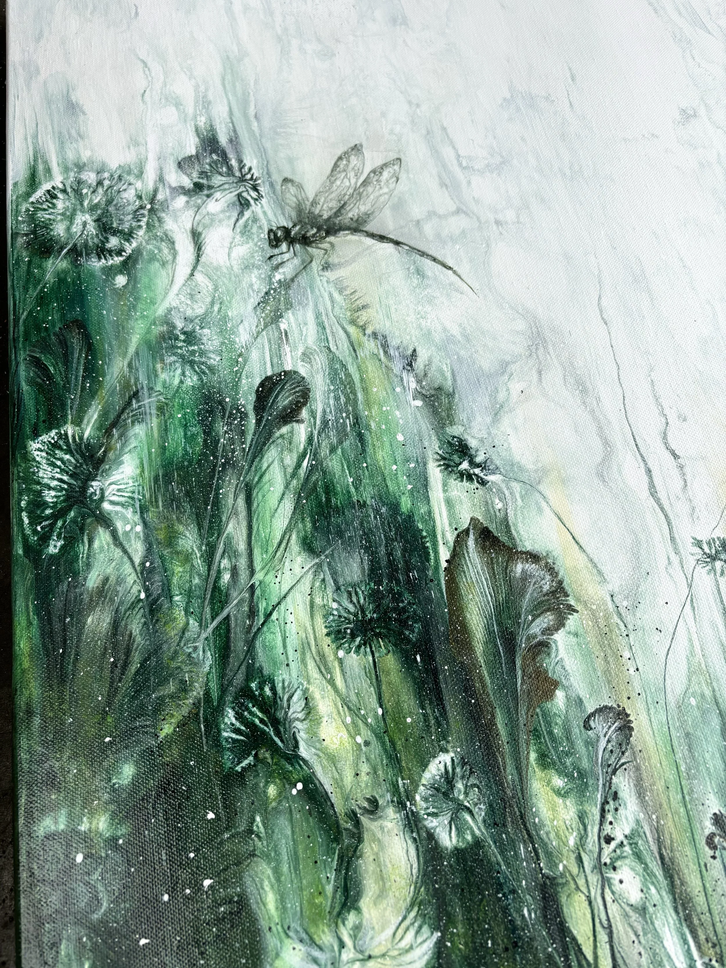 Acrylic Pouring bildet die Basis dieser Kollektion – eine Technik, bei der flüssige Acrylfarben dynamisch ineinanderfließen. Doch meine Kunst geht darüber hinaus: Mit Ketten forme ich organische Ornamente in die noch feuchte Farbe und ziehe somit Muster in beliebige Formen, meist inspiriert von der Natur. So entstehen kunstvolle Strukturen, die an Blätter, Blüten oder filigrane Verästelungen erinnern. Feine Details in Ölmalerei verleihen den Werken zusätzliche Tiefe. Dieses Zusammenspiel aus kontrolliertem Zufall und gezielter Führung der Farben macht jede Kreation einzigartig.